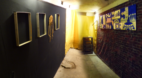 Bild: Acryl, Leinen auf Holzplatte; 200 x 60 cm; Maske: Speckstein patiniert